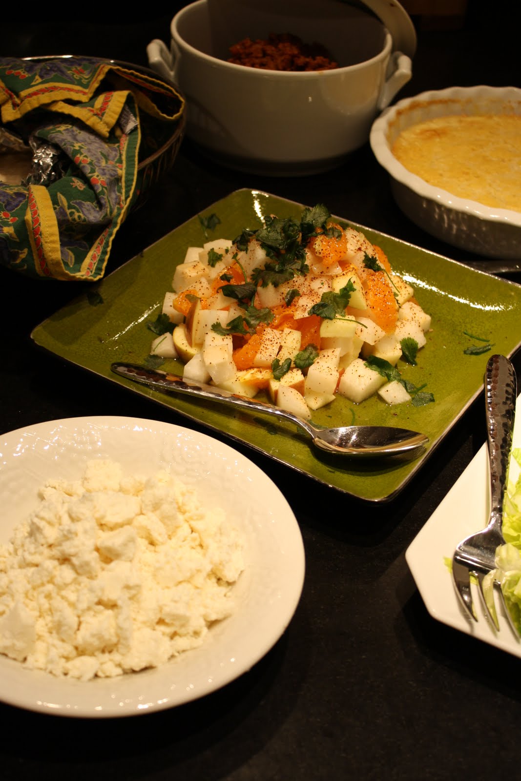 I dare say, it is fine to put the food up on the counters in the kitchen, next to the plates, silverware, and napkins, and allow the diners or guests to fend for themselves in food-serving. There are times, as in the case of the this supper, with food that needs to be assembled to an individuals preferences (menus involving tortilla's and anything, for example), when the food is perfectly graciously - and more effectively - served in a spotless kitchen.